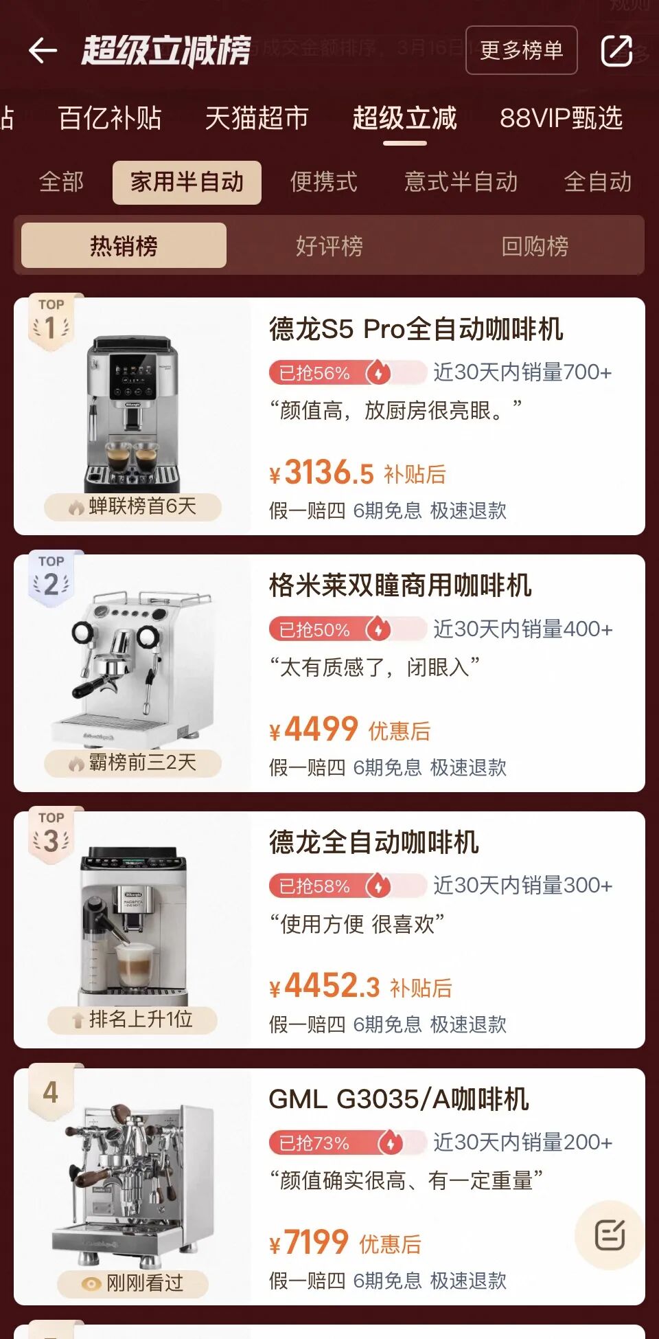 天猫家用半自动咖啡机热销榜上,格米莱售价超过7000元的高端家用“白鲸”系列产品排在第四位,月销量超过200台,该机型就采用了多用于商用机的经典E61冲煮头,搭载58Pro商用萃取系统。
