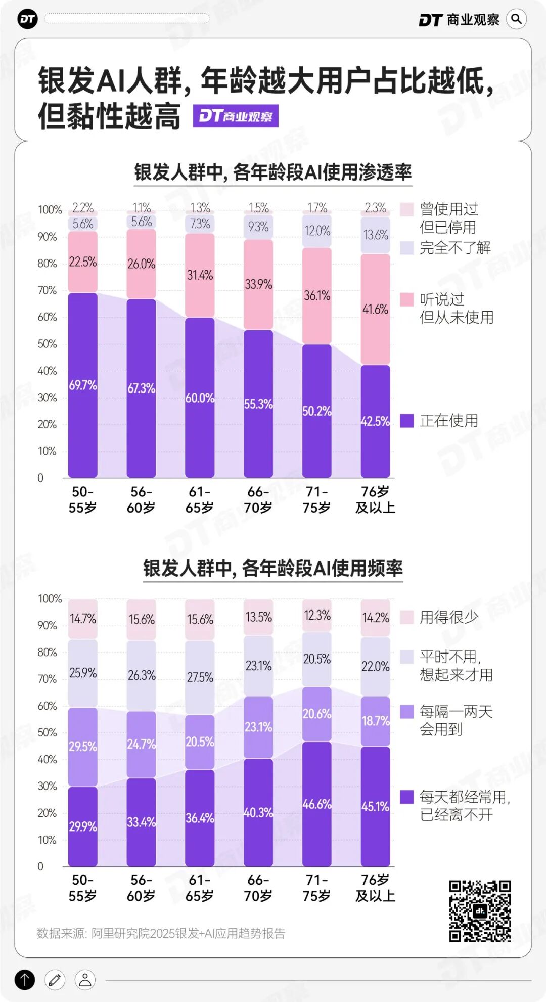 根据报告,银发人群中,年龄段越大,AI使用率越低;但有意思的是,一旦用上AI,基本遵循年龄段越大,黏性反而越高的规律。