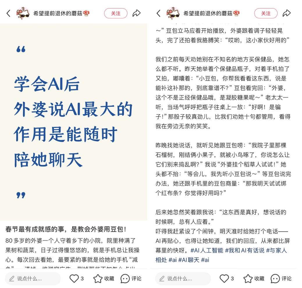 @杨 的姥姥甚至把豆包当作“本地孙女”,比起远在外地、忙于工作的亲孙女,豆包能随时陪聊、贴心回应,从不嫌烦,恰好填补了独居的孤独。