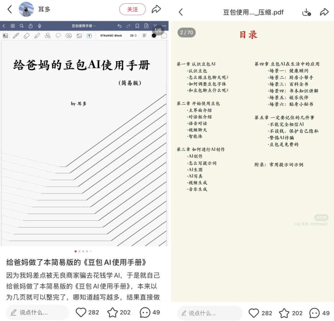 @耳多 为了教会爸妈用AI,甚至写了一本70页的《豆包AI使用手册》,并把自己制作的PDF发在小红书上,收获近400次下载。