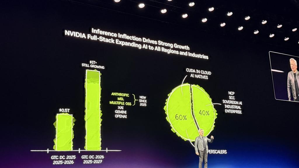 "去年这个时候,我说过,我们看到了5000亿美元的高确信度需求,覆盖Blackwell和Rubin直到2026年。现在,就在此时此地,我看到到2027年至少有1万亿美元的需求(at least $1 trillion)。"