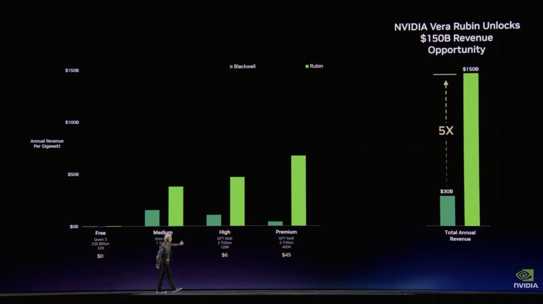他指出,随着模型越来越大、上下文越来越长,AI会变得更聪明,但Token的生成速率会降低。"在这个Token工厂里,你的吞吐量和Token生成速度,将直接转化为你明年的精确收入。"