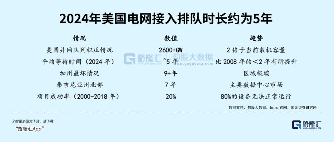更头疼的是,想建个大型数据中心没那么容易。美国现在电网接入排队都要5年,加州个别项目甚至要等9年,就算建好厂房,通不上电也只能当摆设。