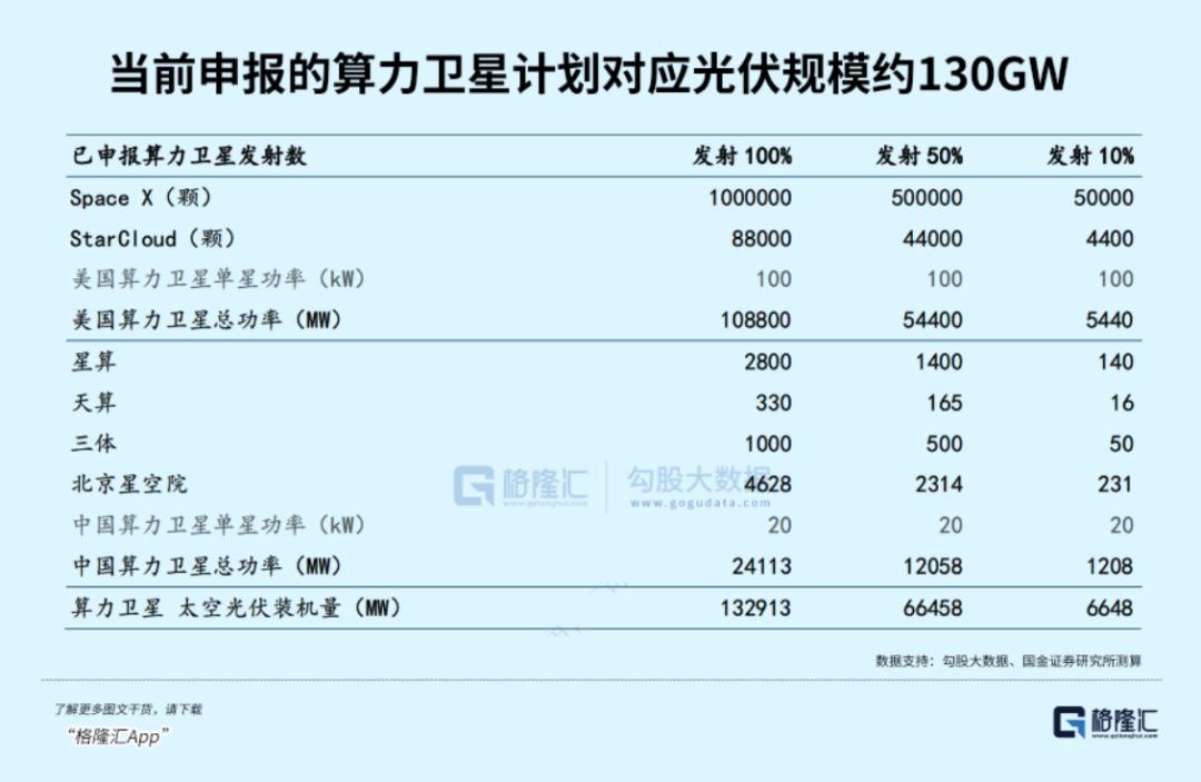 按照当前的申报计划,只要发射量达到100%,对应的太空光伏需求就超过130GW,这是一个万亿级的巨大市场。而且这个需求不是空谈,2025年已经有搭载英伟达H100芯片的算力卫星成功发射。