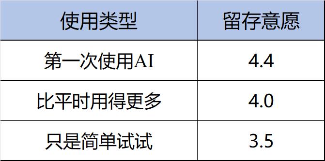 另一个极具启发意义的发现是,首次使用AI的人,反而最可能留下来。不同使用群体的留存意愿为:
