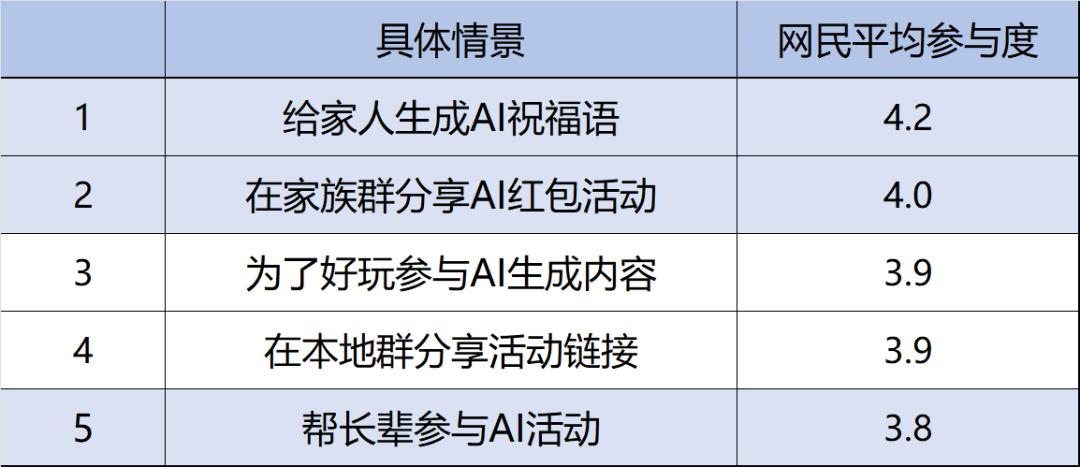 表1. 不同场景中网民参与AI新春创意活动的程度统计表 (数据来源:T-ask调研-这个春节你用上AI了吗?来测一测)