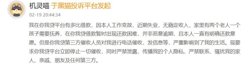 黑猫投诉上一位消费者的经历颇具代表性。该消费者因失业导致借款逾期,结果你我贷的催收人员对其进行了电话催收、发信息等。