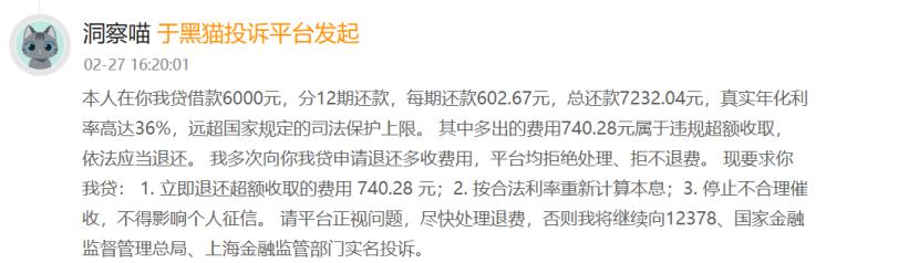 在黑猫投诉平台上,有用户反映,借款6000元,分12期还款,每期还款602.67元,总还款7232.04元,真实年化利率高达36%,远超国家规定的司法保护上限。