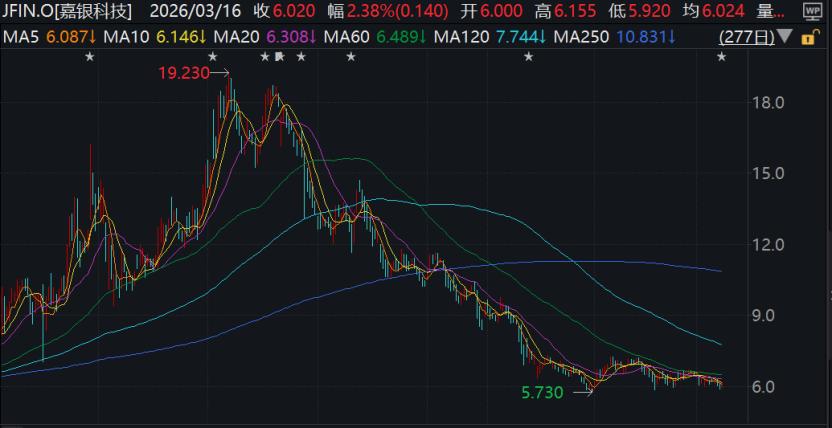 值得注意的是,二级市场早已开始用脚投票。2025年6月中旬,嘉银科技的股价从19.23美元的高点开始大幅下跌,最低跌至12月末的5.73美元。截至2026年3月16日,嘉银科技的股价为6.02美元,较最高点下跌了69%左右。