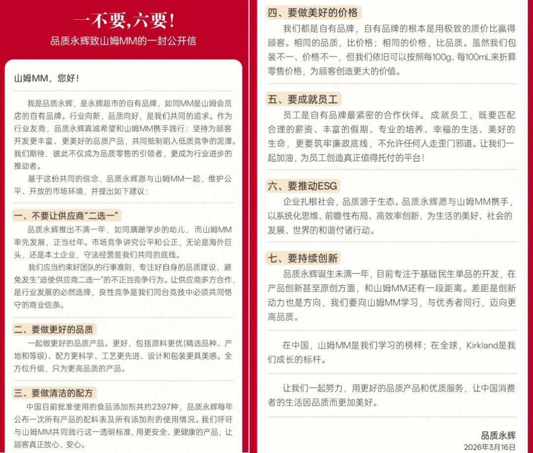 二是永辉超市自有品牌“品质永辉”发布致山姆MM的一封公开信,信中重点呼吁山姆MM不要让供应商“二选一”。相关说法一出,立刻在行业里引发热议,而零供双方合作的“规矩”,也被直接摆到了台面上。