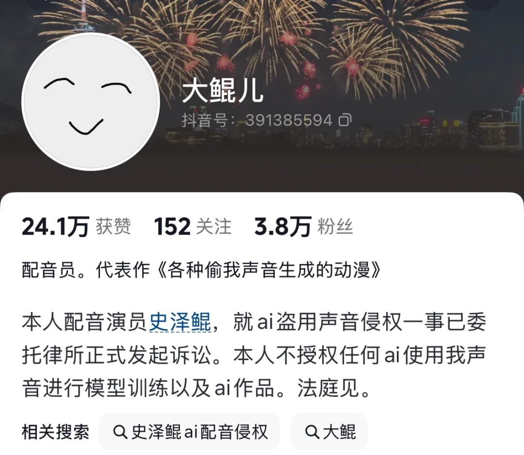 声明中,他们明确划出红线:严禁擅自采集声纹训练AI、建音色库;禁止传播任何利用AI复刻声线的音视频与产品。声明中特别强调,即使打着“学习交流”或“二次创作”的旗号,同样不可接受。值得关注的是,配音演员史泽鲲在声明中宣布,已经针对AI侵权事件委托律师发起诉讼。这场维权战,已经从口头警告进入司法程序。