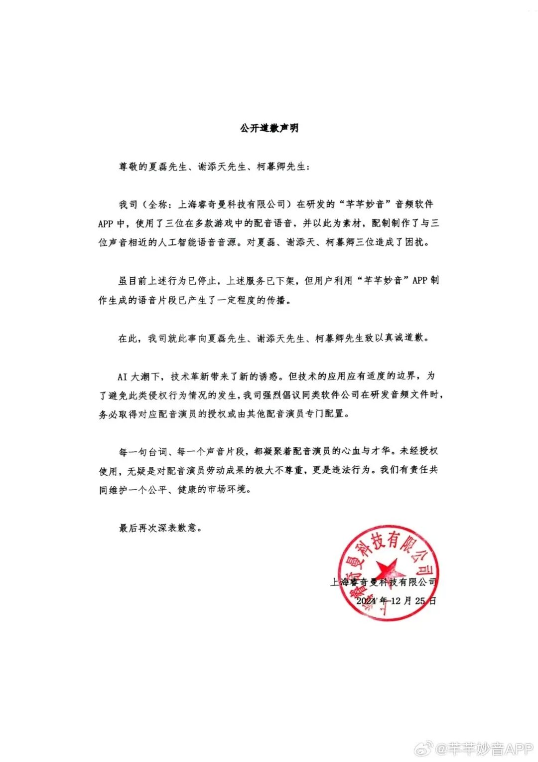 2024年,AI配音软件“芊芊妙音”APP未经授权,擅自使用音熊联萌旗下夏磊、谢添天、柯暮卿三位知名配音演员的语音素材训练人工智能音源。事件曝光后,张杰、夏磊等人曾公开表示反对,但最终侵权方仅受到较轻处罚,未能有效遏制行业乱象。