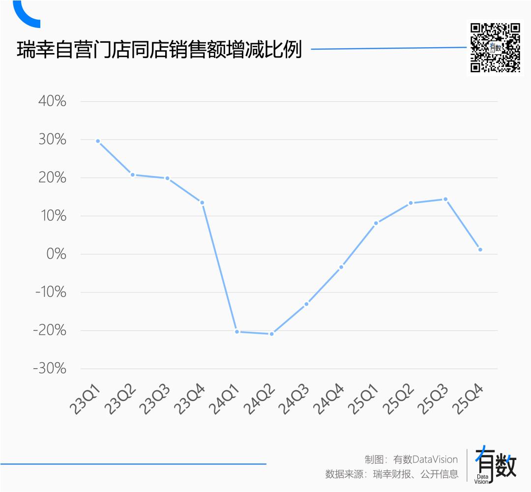 除了整体利润承压,作为盈利基本盘的成熟门店也略显疲态。二季度时,同店销售额尚能维持14.4%的增速,至四季度只剩1.2%,单店创收的引擎也有点扛不住了。