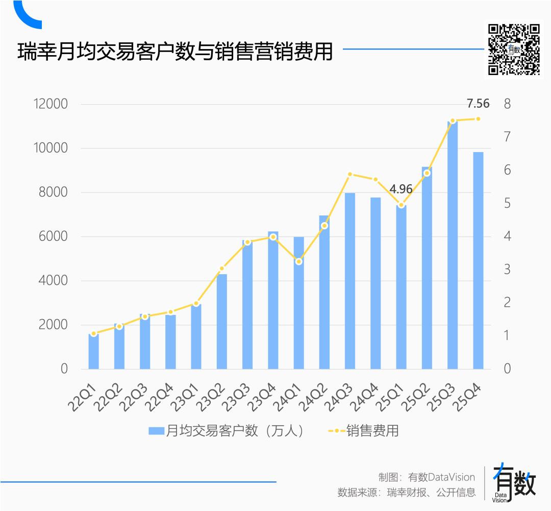 到了三季度,瑞幸月均交易用户冲上1.12亿,同比大增40.6%[1]。四季度是现制饮品行业的传统淡季,月均交易用户回落到1亿以下。但这两个季度,瑞幸的销售营销费用分别上升了27.5%和31.9%。