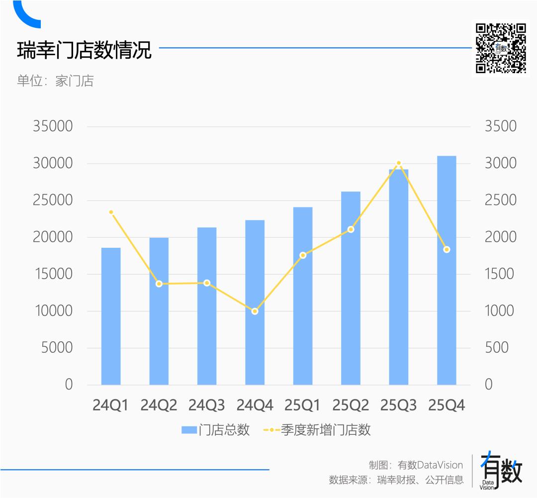 过去几年,瑞幸的开店速度一直在加快。2025年,瑞幸新增门店8708家,作为对比,星巴克国内门店数一共只有8011家[4],相当于瑞幸一年开出了星巴克20年的店。