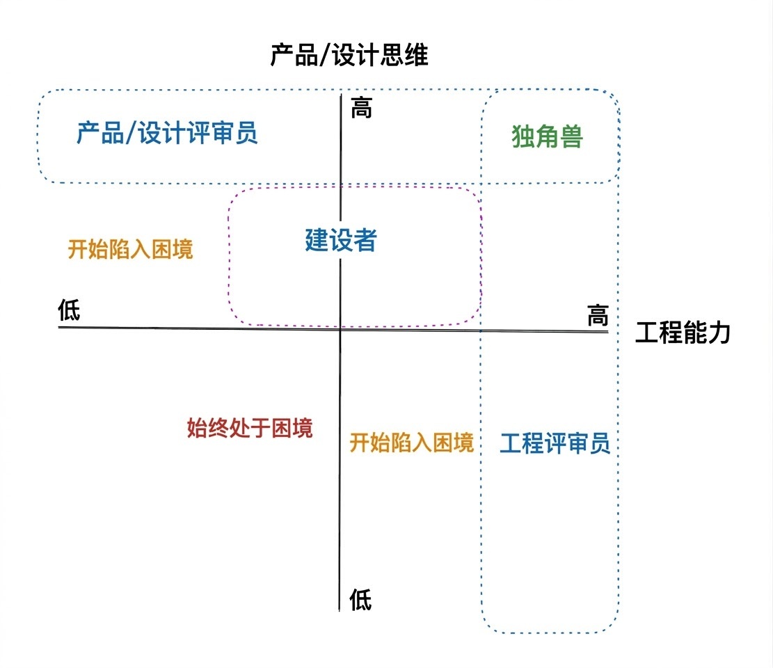 如果你在产品或设计领域,你要么必须拥有卓越的产品/设计心智模式并主攻评审,要么投身编程智能体并提升代码水平。