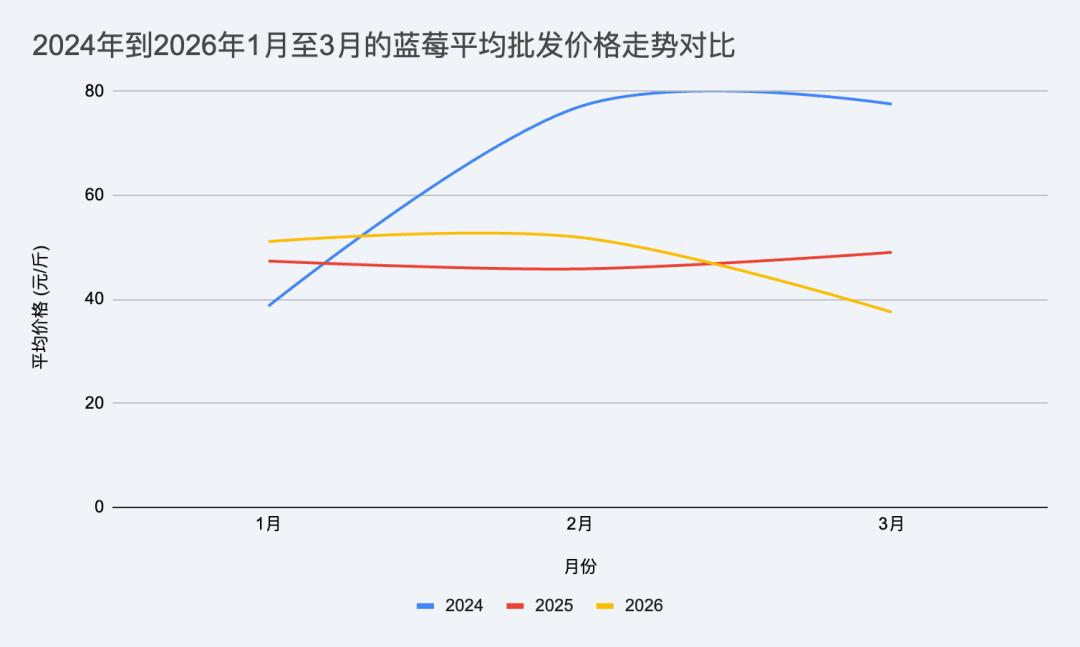 更重要的是,云南蓝莓的普遍上市期是每年11月到次年5月。期间不仅碰上冬季——全国水果品类的「空档」期,也迎上了春节,价格自然水涨船高。根据新发地价格行情的数据,2024年春节,蓝莓的平均批发价一度飙升至每斤95元。此后的两年,价格虽有回落,但依旧维持在每斤50元上下。
