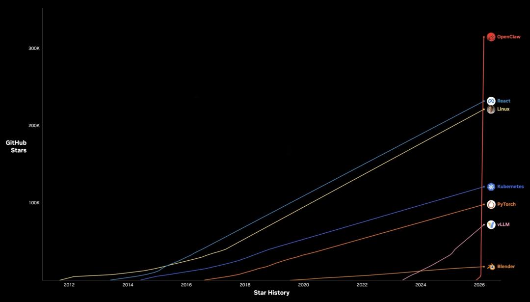 上线GitHub后,OpenClaw仅仅用了两个月,就超越了Linux、React一众开源项目,登顶GitHub榜首。