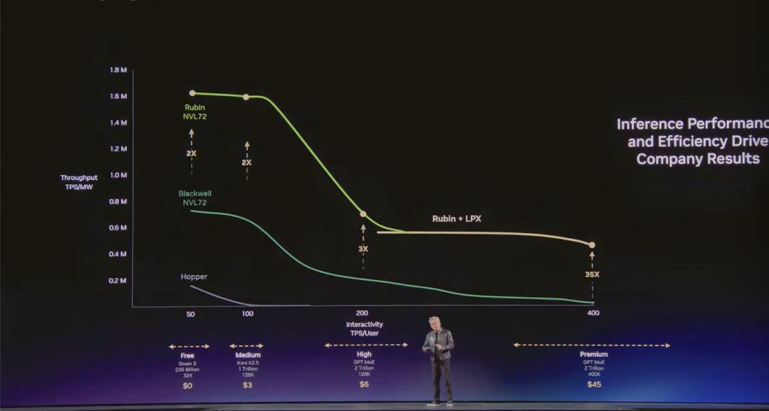 黄仁勋强调,英伟达的三大架构都将让客户在免费层,实现极高的吞吐量,而在最高价值的推理层级上,英伟达的新架构吞吐量效率将提升35倍。