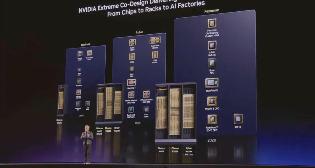 △英伟达的平台路线构成(Blackwell、Rubin、Feynamn),图源:发布会截图
