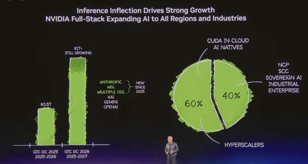 2025年的GTC上,黄仁勋预测,Blackwell和Rubin平台在2026年之前采购订单规模预期是5000亿美元。而此次GTC上,他给出明年的新目标是,这一数字将翻倍到1万亿美元以上。这一雄心,很快得到二级市场的反应,一度推动英伟达的股价上涨4.3%。