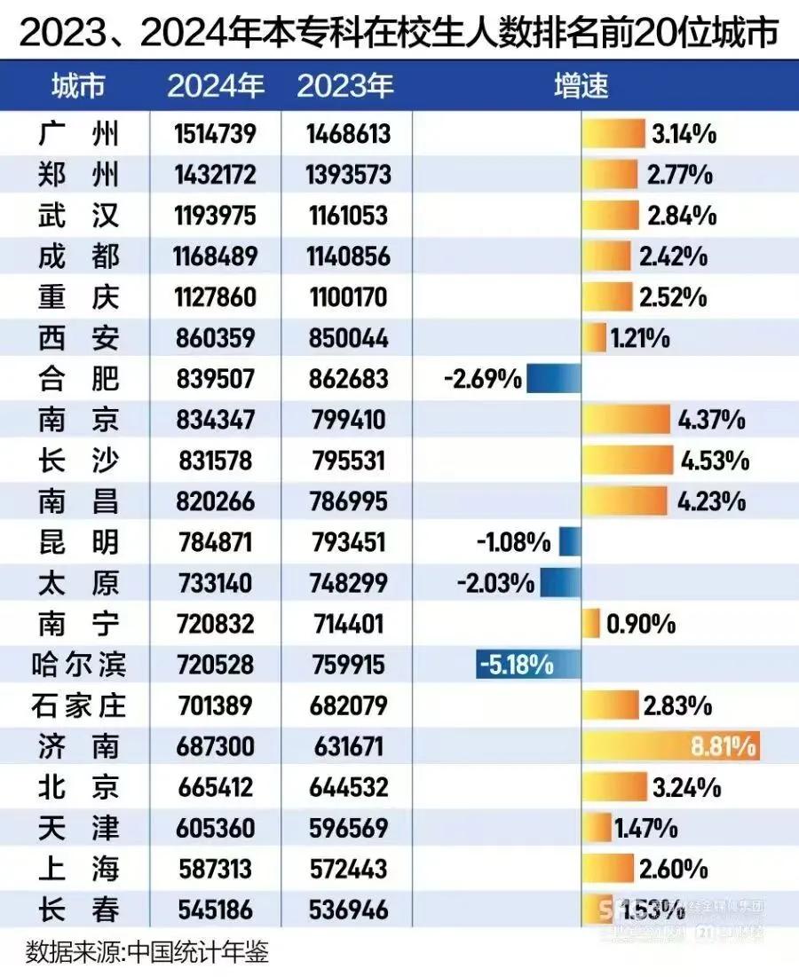 同时,三座城市,又共同面临的一个尴尬是,作为大学生数量排名全国前十的高等教育重镇,大学生留存率却偏低。