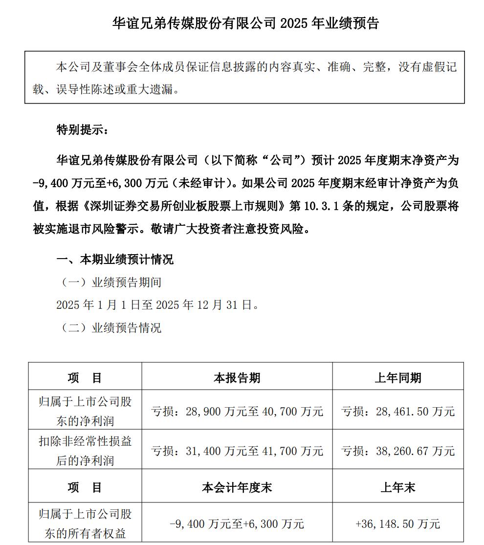 更让市场紧张的是净资产状况。公告显示,经初步测算,公司2025年期末净资产为-9400万元至+6300万元(未经审计),几乎就在“正负之间”徘徊。如果最终审计结果落入负值区间,根据《深圳证券交易所创业板股票上市规则》,公司股票将被实施退市风险警示。换句话说,华谊兄弟如今已经站在退市悬崖边缘。