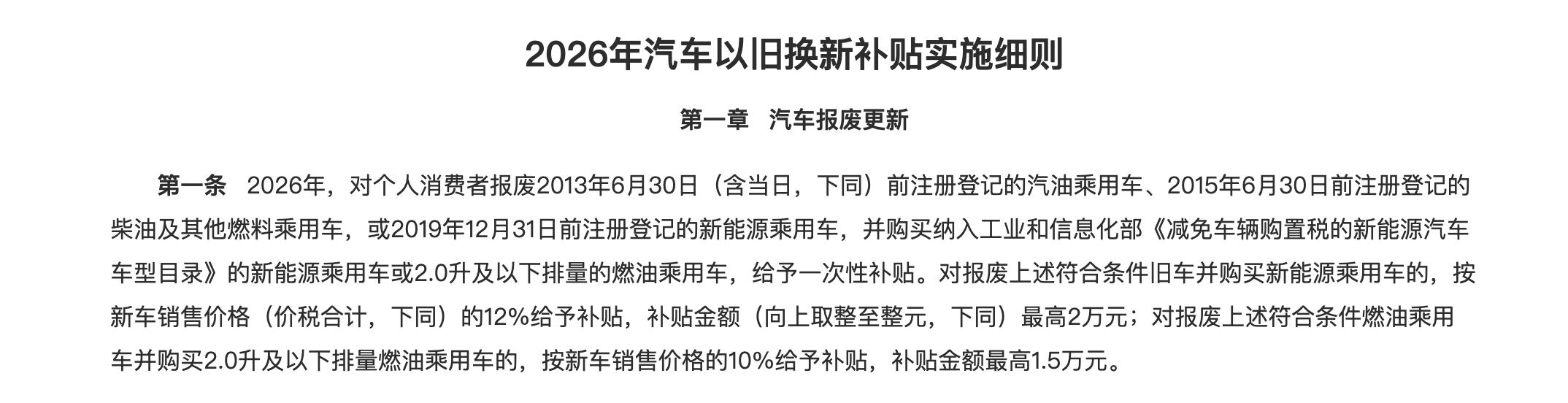相关部门已经意识到了第一批新能源汽车车主的窘境,也出台了一系列置换补贴措施。《2026年汽车以旧换新补贴实施细则》指出,2019年12月31日前登记注册的新能源汽车,按照新车销售价格(价税合计)的12%给予报废补贴,补贴金额最高2万元。燃油车却没有这么好的福利,报废补贴比例仅10%,最高金额仅1.5万元,还限制排量在2.0T及以下。