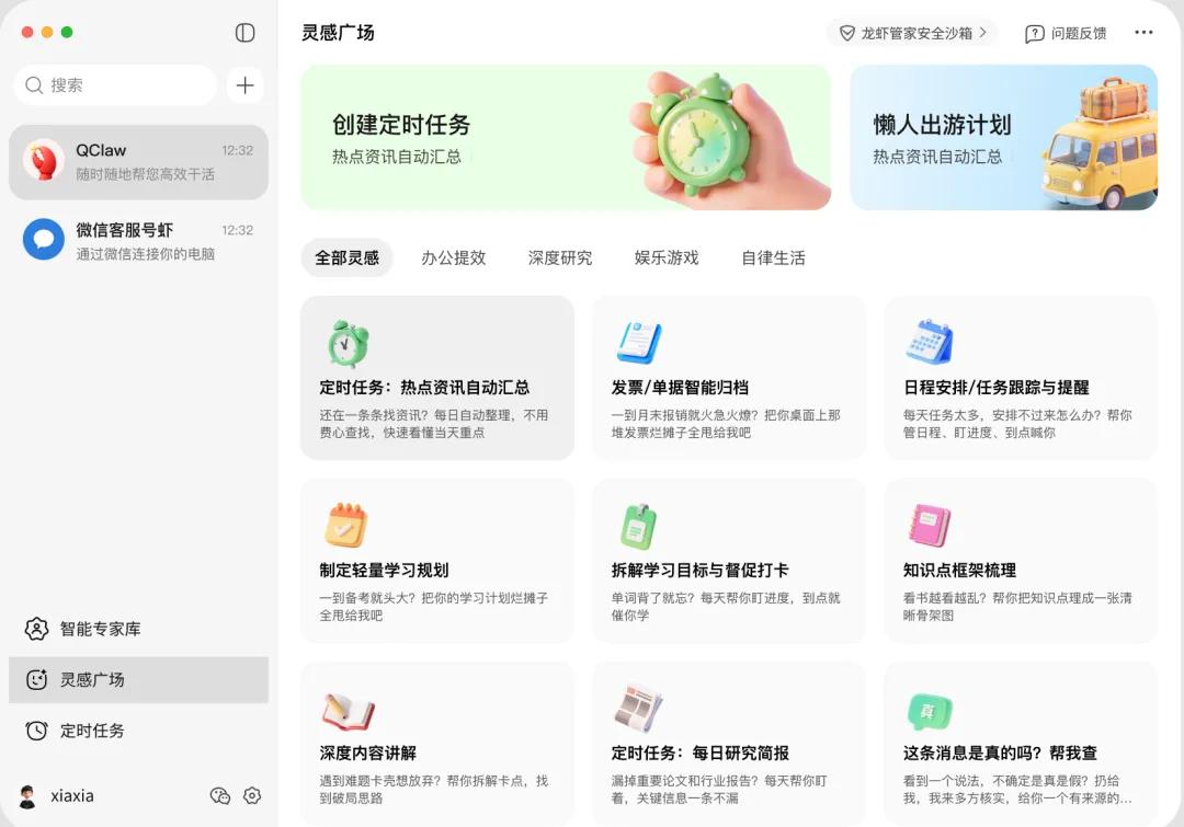与此同时,为了进一步降低AI智能体的使用门槛,新版QClaw(v0.1.9)同步上线了“灵感广场”功能,围绕办公提效、深度研究、娱乐游戏等场景预置了常用任务及对应技能(Skills),用户无需编写复杂指令,点击即可运行。