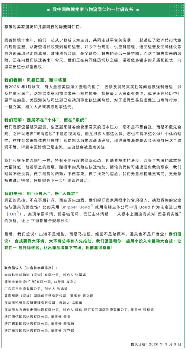 3月9日,大森林、德速、纽酷、凯琦、锦联等10家FBA头程物流领军企业联合发布了《致中国跨境卖家与物流同仁的倡议书》,呼吁集体停止“双清包税”物流模式。倡议书还写明,“双清包税”本质上是行业大环境共同作用的结果,主张通过申请Bond、使用正规主体作为IOR、单票单清等方式,共同推动合规生态建设。