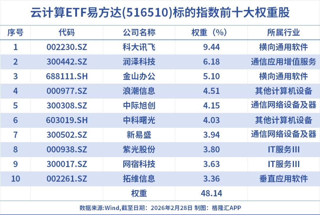 云计算ETF易方达(516510)最新规模25.64亿元,居同标的ETF第一,综合费率0.2%/年,同类最低,助力投资者低成本布局云计算产业链龙头;其跟踪中证云计算与大数据主题指数,标的指数囊括AI上游基建、中游模型、下游应用,成份股覆盖光模块龙头中际旭创、新易盛;电子终端及组件龙头中科曙光、浪潮信息;软件开发龙头科大讯飞、金山办公;IT服务紫光股份、润和软件等公司。