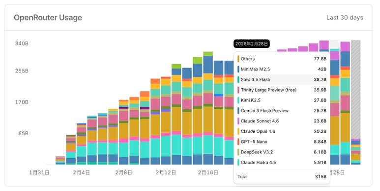 第三重利好是海外增量。此前,海外用户大多依赖GPT-5、Claude等模型,但这些顶级虾粮实在太贵,不少用户开始尝试国产虾粮,这让国产模厂在海外市场也赚到了真金白银。在OpenRouter的龙虾模型调用量榜单上,国产模型已经超过一半,Step 3.5 Flash、MiniMax M2.5、Kimi K2.5作为“国产龙虾三剑客”,成为虾粮市场的主力军。