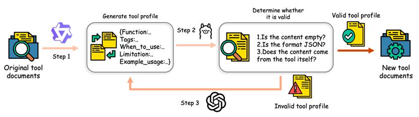 通过这一“LLM扩展→LLM校验→再生成修正→人工抽检”的流程,原始工具文档被系统性地补充为结构化的工具描述,使文档语义更加完整,同时保持对原始工具信息的忠实表达。