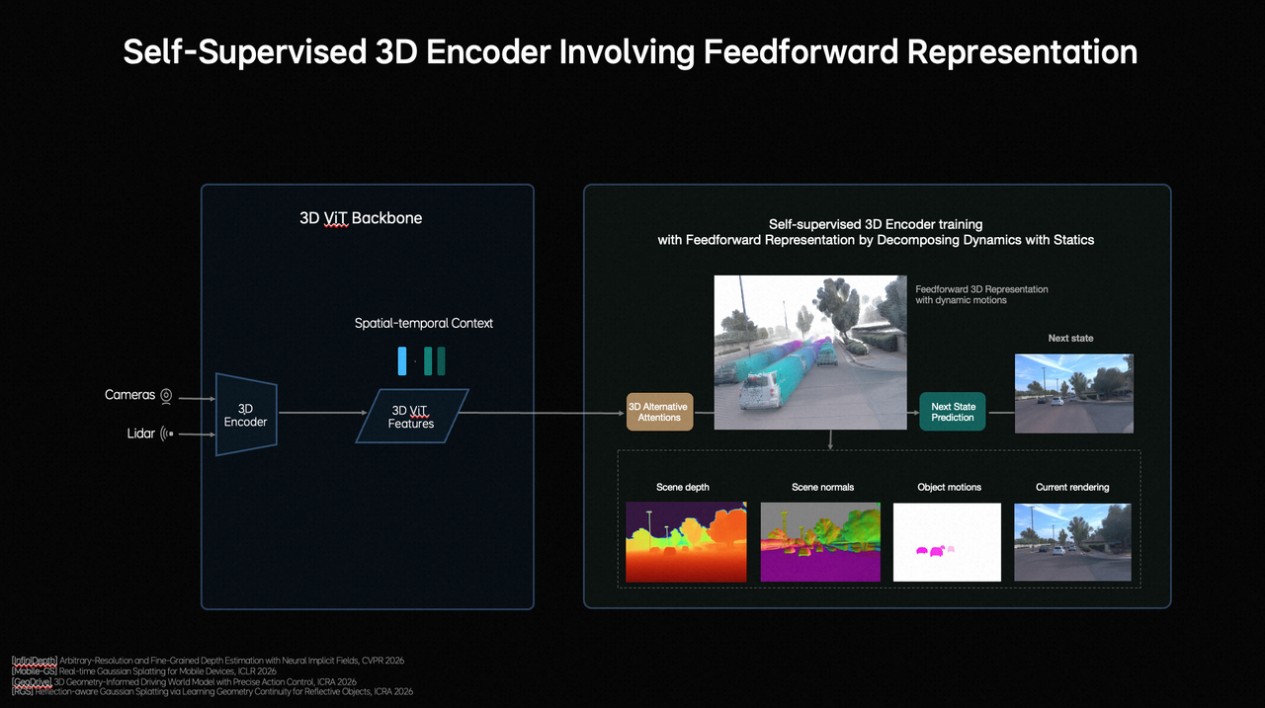 在感知层面,理想汽车采用以视觉为核心的 3D ViT Encoder(3D视觉模型编码器),并利用激光雷达点云作为三维几何提示,引导模型理解真实空间结构,使其在单一表示中同时具备语义理解与三维感知能力。同时引入前馈式3DGS表示(Feedforward 3D Representation),将场景拆分为静态环境与动态物体分别建模,并通过下一帧预测(Next-state prediction)作为自监督信号,使模型同时学习深度信息、语义结构与物体运动,最终形成融合空间结构与时间上下文的高质量3D表示。具备3D空间理解能力,使模型看得更远。