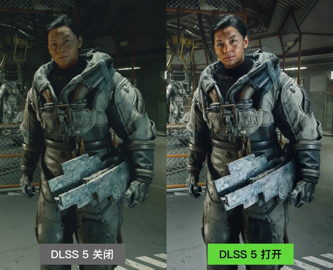 而 DLSS 5,则是以游戏生成的画面为基础,利用 AI 生成本来不存在的材质、光照和反射细节,让画面变得更具真实感: