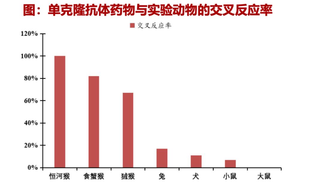 实验猴与人类的生物学反应高度相似,不仅能够精准表达候选药物的靶向表位,还能有效避免生物制品免疫原性在部分动物体内产生的异常免疫反应。尤其是相较于犬、兔、小鼠、大鼠等常规实验动物,实验猴的优势突出:例如单抗与食蟹猴的交叉反应率约为82%,远高于其他常规实验动物,许多关键的药物反应的,仅能在实验猴体内观察到,无法通过啮齿类动物模拟。