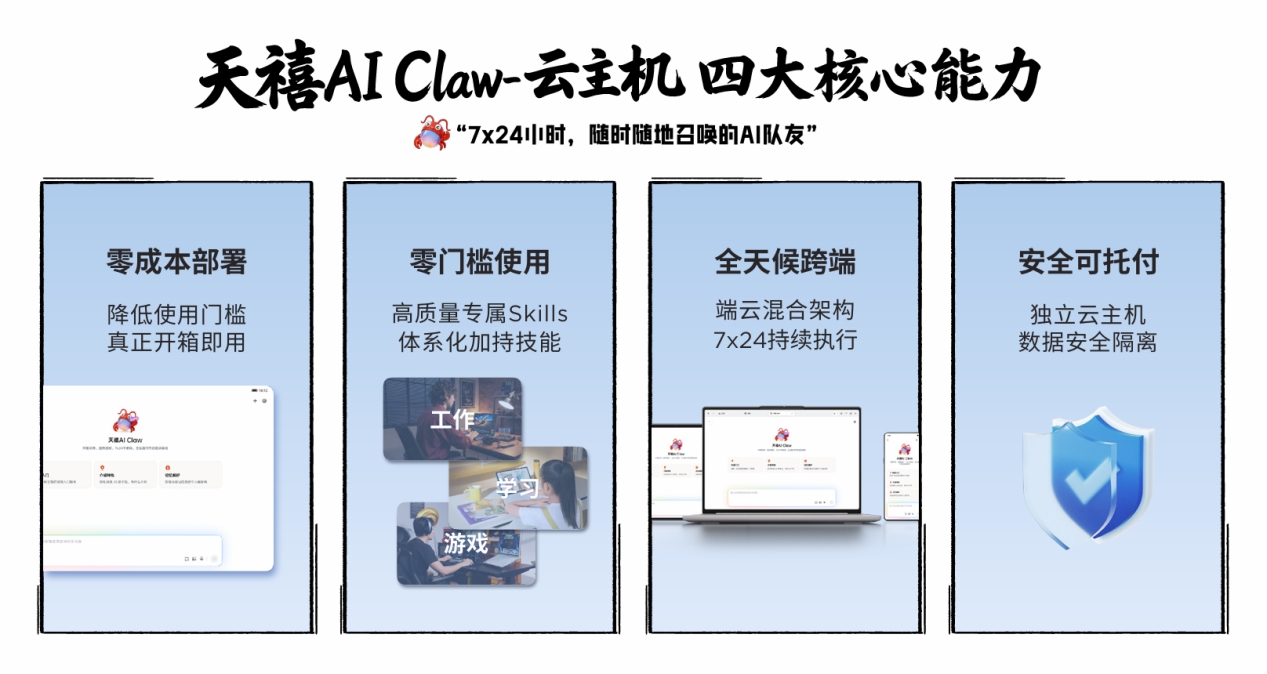 使用层面上,天禧AI Claw云主机构建了一整套面向真实使用场景的核心能力框架,将复杂留给系统,将轻松交还给用户: