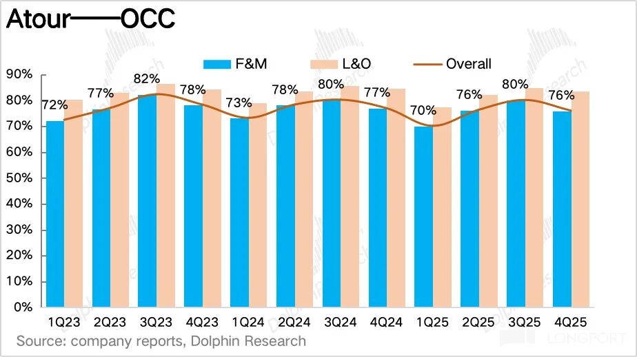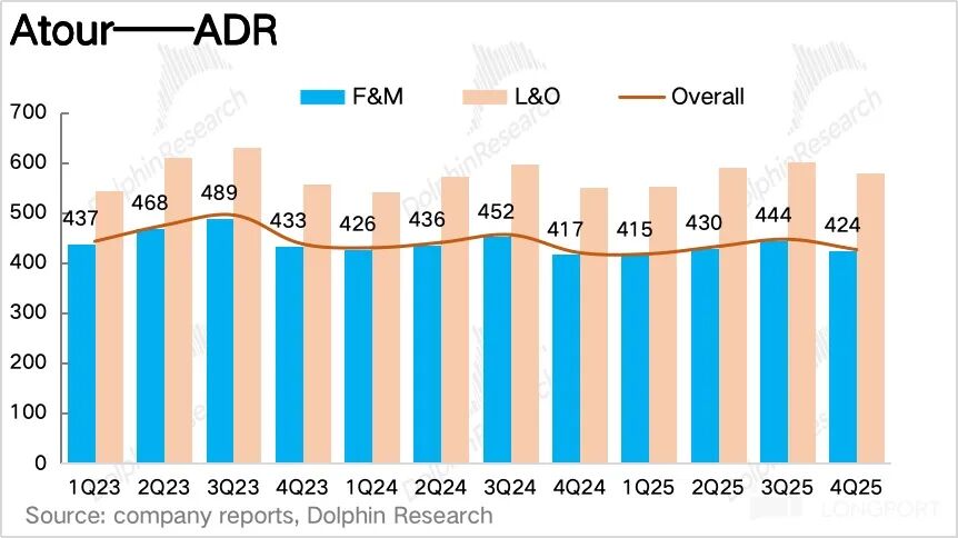 而亚朵通过严格控价、提升中高端产品线占比等方式逆势实现了 ADR 的正增长,抵消了 OCC 的季节性环比回落,海豚君认为这不仅验证了亚朵自身的品牌粘性(用户愿为价值付费,而非低价选择),更向市场证明了其可以摆脱 “低价内卷” 的增长陷阱。