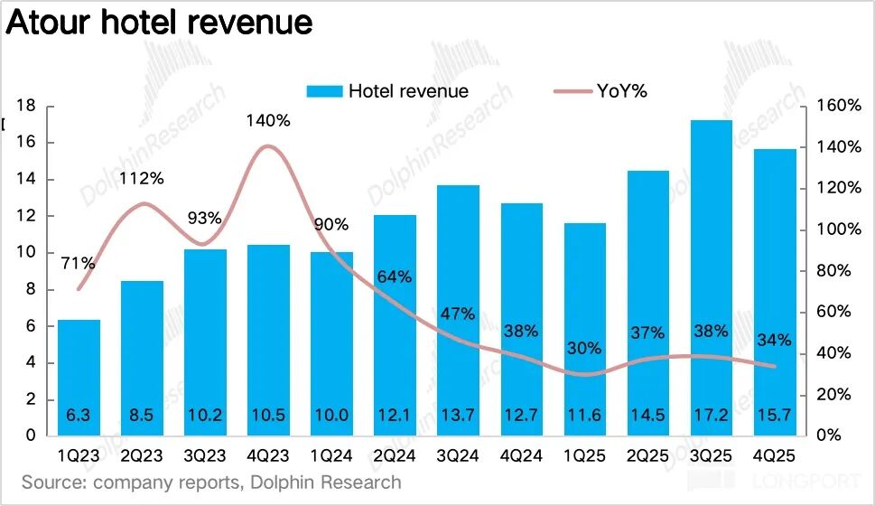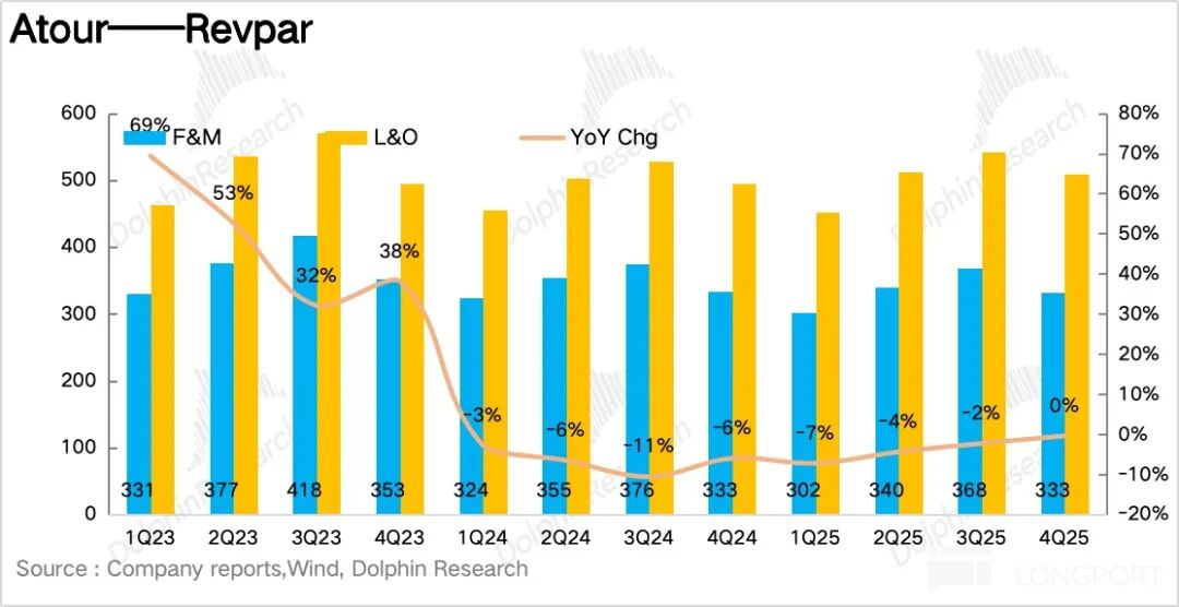 从最核心的经营指标每间可售房收入(RevPAR)看,四季度亚朵每间可售房收入为 336 元/晚,小幅下滑 0.4%,趋势上降幅仍在收窄。