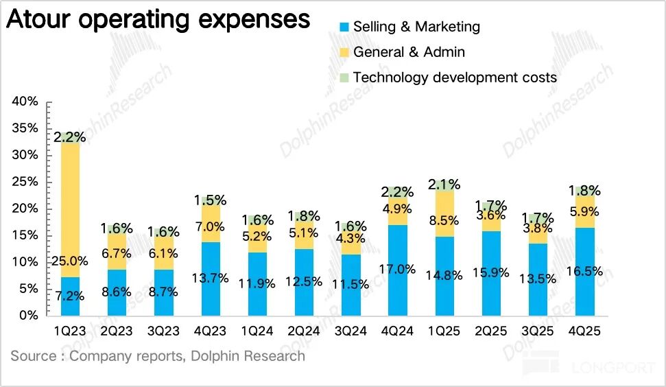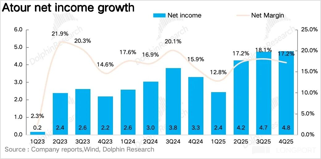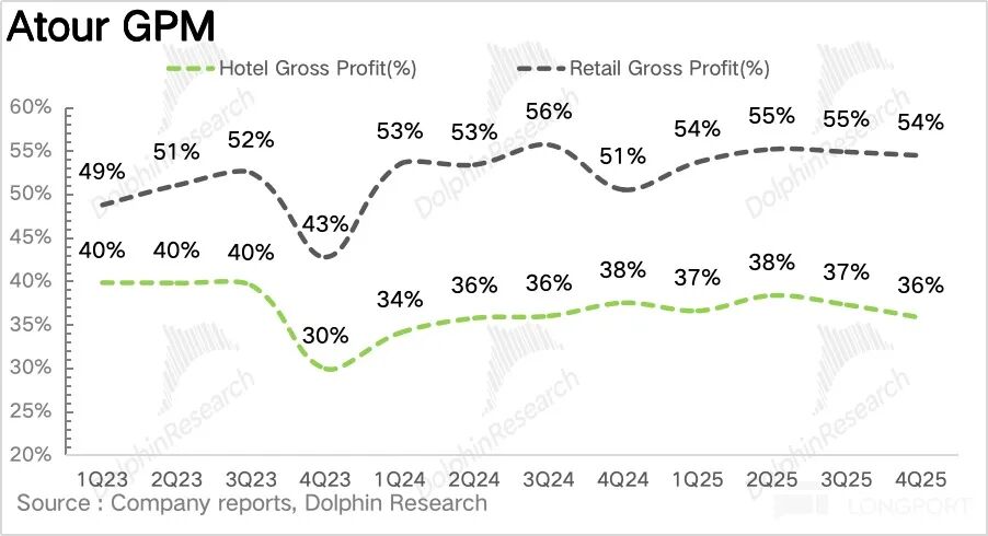 亚朵 25Q4 毛利率为 44%,同比提升 1.4pct。
