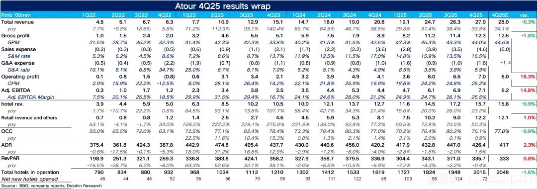 北京时间 2026 年 3 月 17 日美股盘前,亚朵(ATAT)发布了 2025 年 4 季度财报,整体来说,亚朵这个季度的业绩还是不错的,营收上和预期持平的情况下,受益于零售业务的高速增长,经营杠杆释放带动利润端超出市场预期。具体来看: