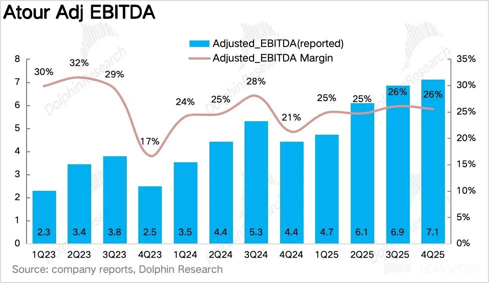 费用端,虽然 Q4 亚朵仍然积极在抖音/小红书等平台投流,提升亚朵星球的品牌知名度,但在规模效应下,销售费用率小幅下滑 0.5pct 达到 16.5%。由于后台系统的升级以及人才的培养,亚朵 Q4 管理费用率阶段性有所提升,最终,亚朵调整后 EBITDA 达到 7.1 亿元,同比增长 61%,超出市场一致预期(23.4 亿元)