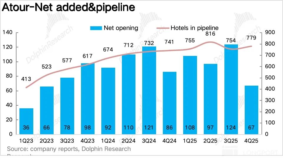 具体来说,亚朵 4.0(见野)经过前期模型的验证,在 2025 年也进入了规模化落地期,Q4 新增 49 家(占新开门店 73%),集中在北上广深等核心城市核心商圈,海豚君推测加盟商为了抢占来年春季的商旅市场、在年底加快了亚朵 4.0(见野)的签约力度