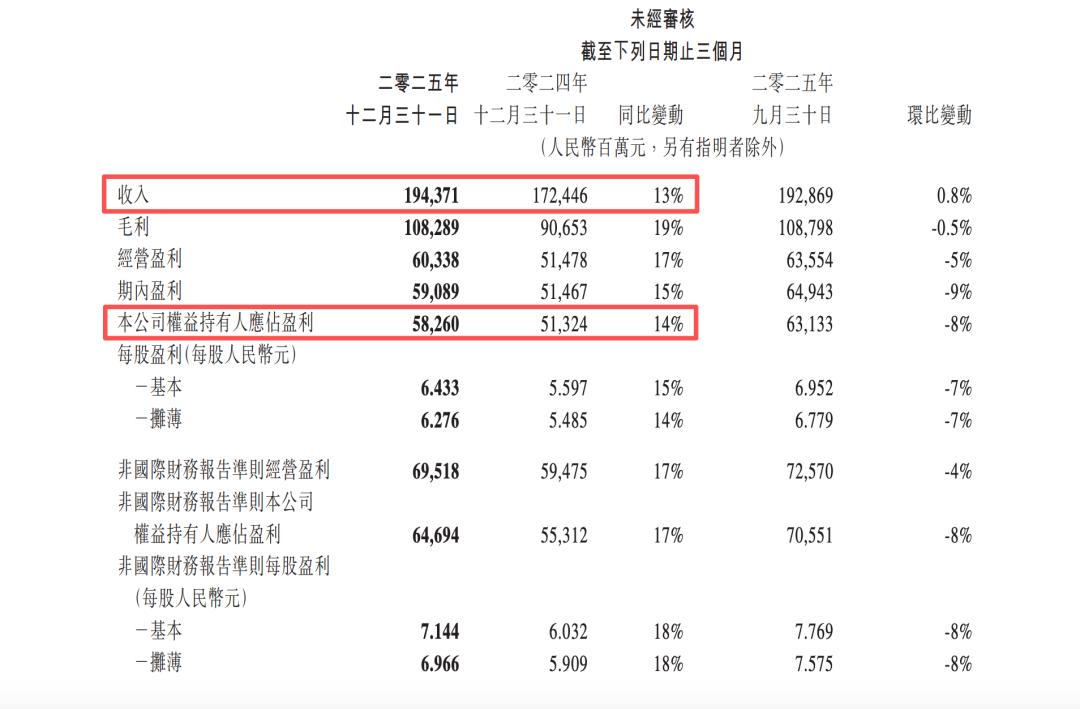 据财报数据显示,在25年Q4期间,腾讯营收同比增长13%至1943.71亿元;公司权益持有人应占盈利582.6亿元,同比增长14%。