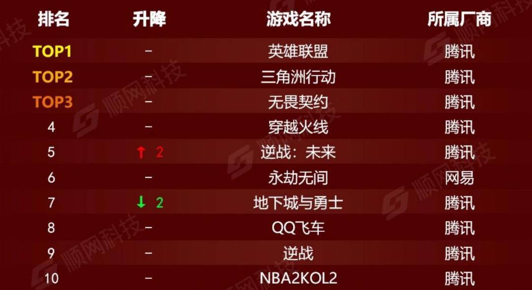 像是今年春节档期间,国内iOS畅销榜Top10大部分时间都被腾讯占据了七席以上;由顺网星研社发布的《网吧网游热力榜》也显示,过去五期榜单里,国内网吧最热游戏前十均有九款为“腾讯系”。其他厂商的产品里面,仅有网易旗下的《永劫无间》能够稳定跻身这一行列。