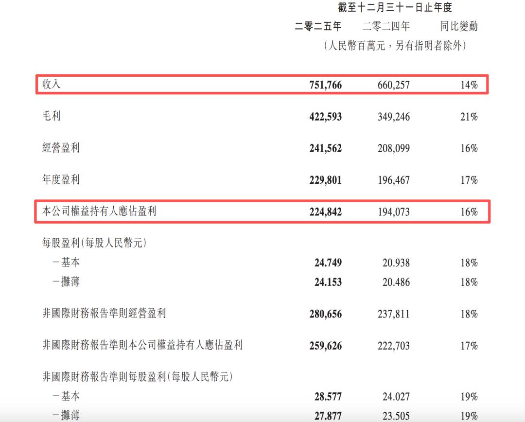而从全年数据来看,腾讯的2025年全年营收突破了7517.66亿元,同步增长14%;公司权益持有人应占盈利突破2000亿关口,达到2248.42亿元,同比增长16%。
