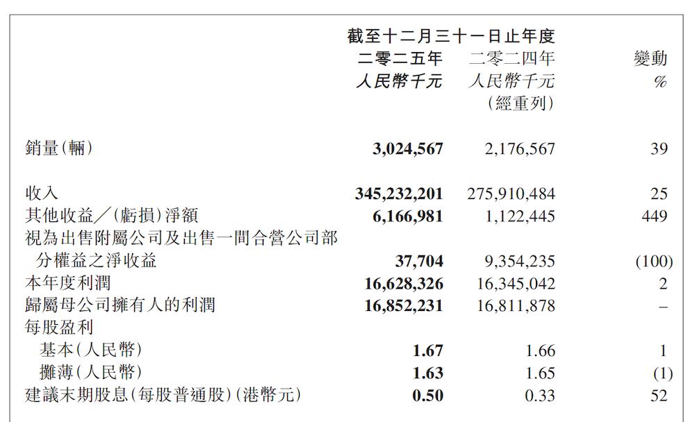 吉利汽车集团2025年净利润为人民币166.3亿元,相比2024年163.5亿元的净利润,仅多赚约3亿元,同比增长2%,其归属于母公司拥有人的利润为人民币168.5亿元,几乎和2024年数据(168.1亿元)持平。