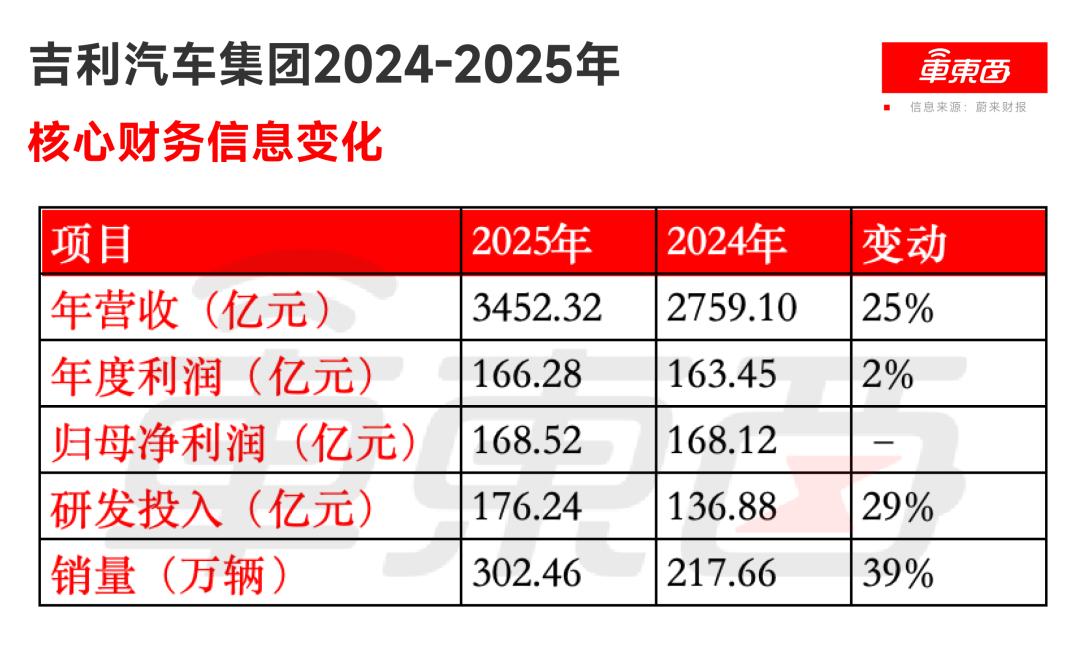 从吉利汽车集团2025年财报来看,在其营收突破3452亿元、销量超300万辆的亮眼数据背后,净利润仅微增2%,毛利率也变化不大。