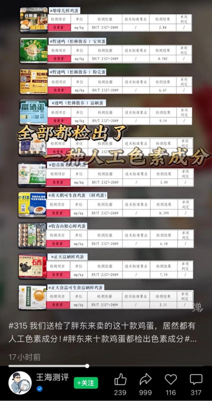视频中,王海团队直接将矛头对准胖东来,称其在许昌当地的门店内,随机购买10款鸡蛋,并送往专业检测机构进行检测。