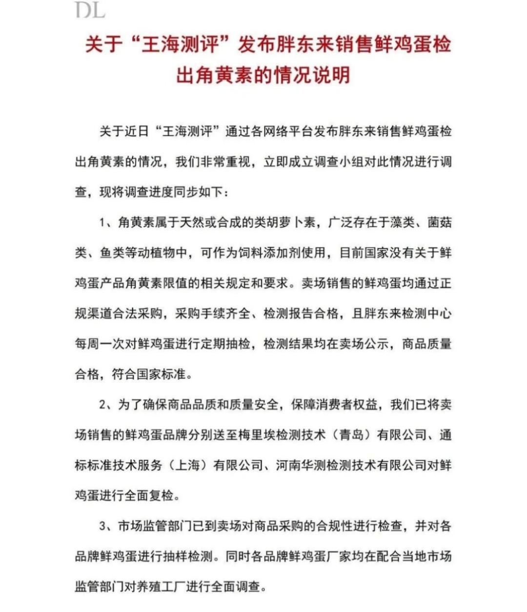 为自证清白,胖东来已将涉事的10款鸡蛋分别送往SGS、华测、梅里埃三家权威检测机构重新检测,同时主动配合许昌市市场监管局的相关调查。